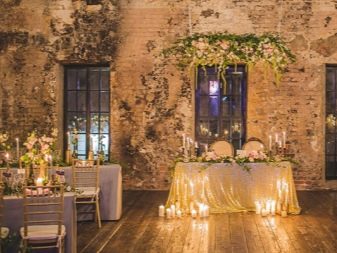 Нельзя сказать, что стиль лофт вычурный и помпезный. Он скорее сдержанный и аристократичный. Его сдержанность проявлена в минимальном украшении торжества, а основным декором являются цветы, камерный свет под потолком и свечи на круглых столах на 10 человек. Аристократичность же показана помпезной мебелью, которая представлена стульями, столами и несколькими диванами, а также изысканной посудой.