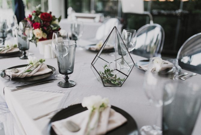 - Проследите за размерами букетов и цветочных композиций на столах. Их оптимальная высота – не выше 30 см.
