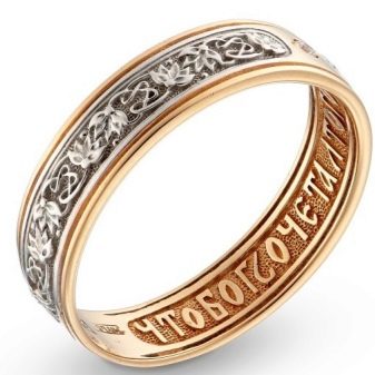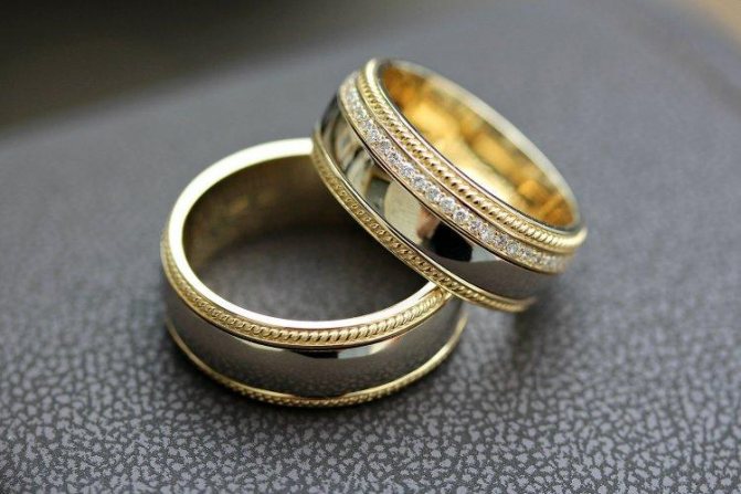 По древней традиции на венчание покупалось два кольца — золотое и серебряное. Золотое олицетворяло солнечный свет и мужскую силу. А серебряное воплощало образ лунного света и, стало быть, женского начала. В наше время эта традиция практически отошла в прошлое. Зачастую покупаются одинаковые золотые или же серебряные кольца. Можно выбрать модели, инкрустированные драгоценными камнями. Но всё же лучше отдать предпочтение не очень вычурному, кричащему варианту.