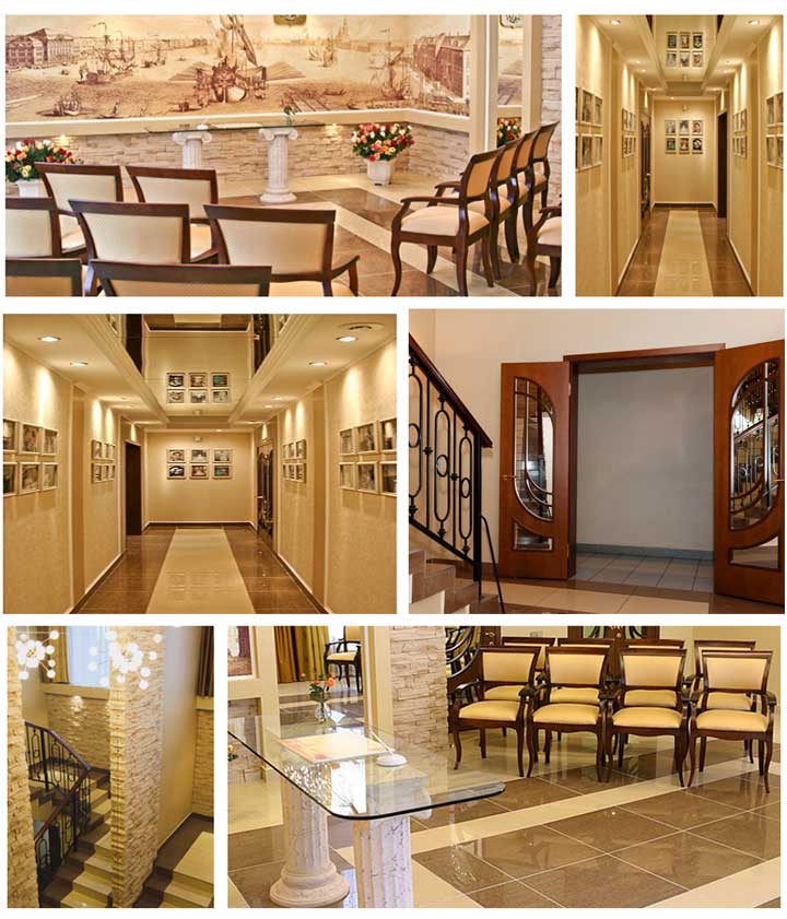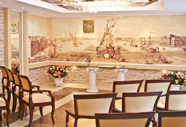 В этом заведении нет типичных для крупных питерских ЗАГСов высоких потолков, лепнины, колонн и панорамных окон. Все устроено лаконично, но в то же время удобно и с учетом требований. Во всех комнатах и холле расставлены уютные диванчики, кресла, столики, стулья. На стенах развешаны большие зеркала и тематические фотографии.