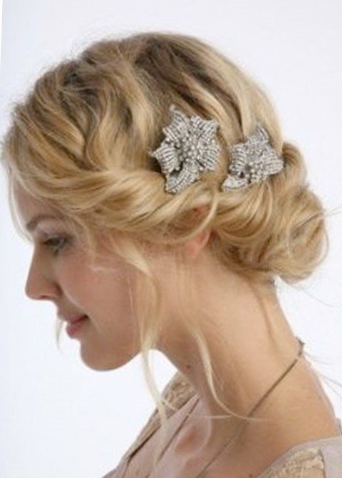 - Прически со структурированными прядями разной длины, уложенными полукольцами и зафиксированные шпильками с розами или орхидеями.
