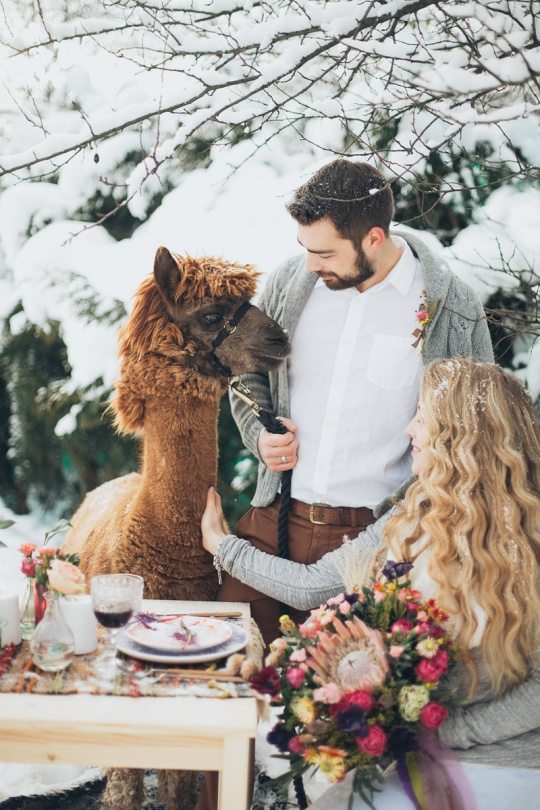 Конечно, фотографии с любимым питомцем – это классика жанра. Но можно же заказать съемку и с экзотическими животными: для зимы идеально подходят северные олени, лисы и альпаки.